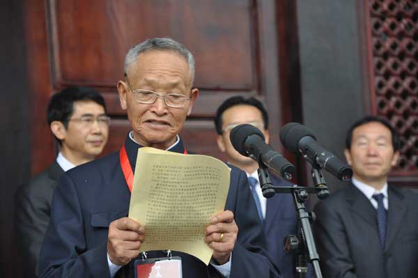 云南省黃埔同學會副會長、騰沖縣黃埔同學會會長盧彩文作為抗日老兵代表發(fā)言