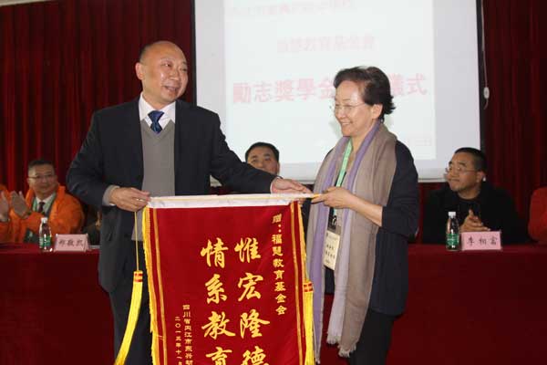 基金會代表鄭敬凱先生講話,希望同學們不怕困難和挫折,好好念書,將愛心之火傳遞下去。加拿大福慧教育基金會已是第二次向該校頒發勵志獎學金,此獎學金由四川省黃埔軍校同學會于2012年初牽線搭橋促成。