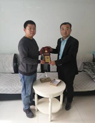郭廣勇(右)向傅柏齡親屬送上紀念章