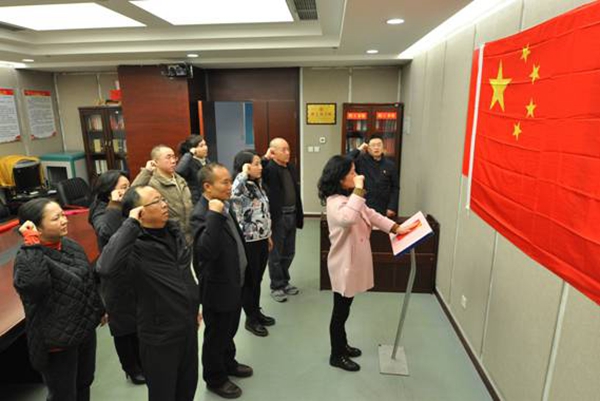 宣誓儀式上,全體機(jī)關(guān)干部整齊列隊(duì)、嚴(yán)肅認(rèn)真,集體高唱國歌,跟隨秘書長楊震環(huán)的領(lǐng)誓,大家面向國旗作出自己的莊嚴(yán)承諾。