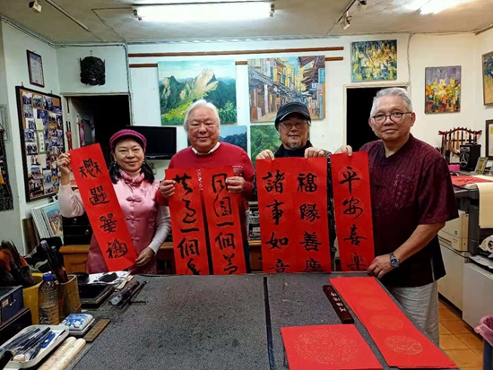 活動中,津臺兩地書畫家視頻書畫傳情,用一幅幅或大氣磅礴或傳神靈動或寓意吉祥的書畫作品,祝福我們的國家山河無恙、國泰民安。書畫家們還通過網絡向兩岸同胞互送新春祝福,祈愿祖國強盛,同圓一個夢想,共迎美好未來。活動現場一幅幅對聯、“福”字烘托出濃濃的兩岸情誼和紅紅火火的中國年氛圍。