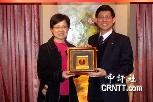 | 黃埔軍校同學會副秘書長鄭琴(左)與臺灣中華工商業聯合會主席李玉文交換紀念品 (中評社高易伸攝) |