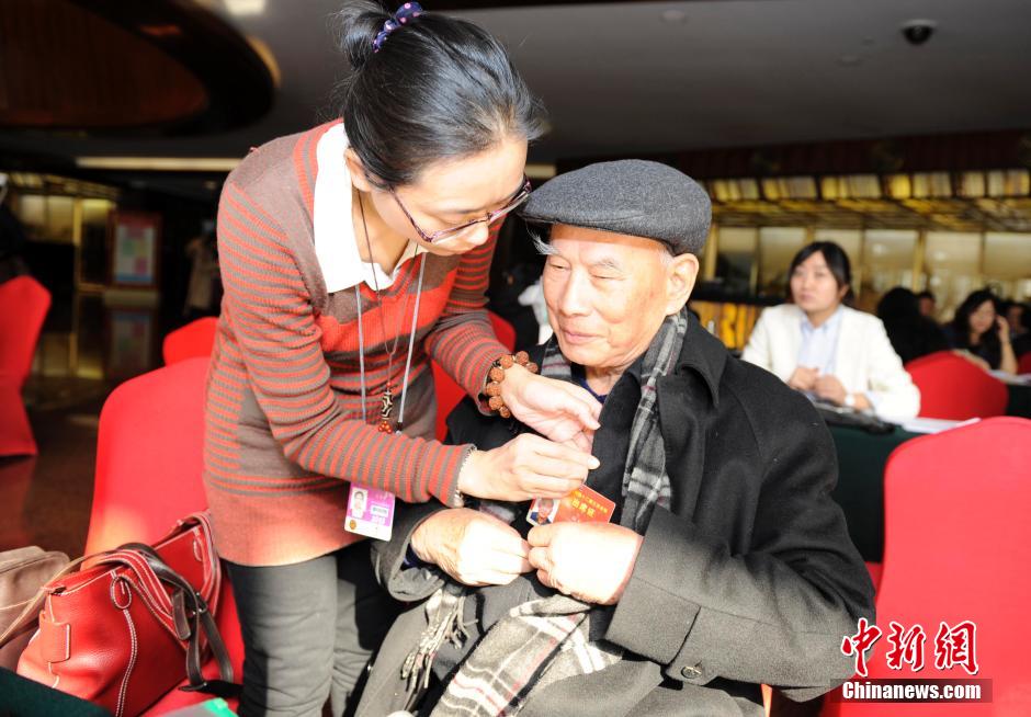 3月2日,參加全國政協(xié)十二屆三次會議的政協(xié)委員、黃埔軍校同學(xué)會會長林上元在駐地報到,工作人員為他佩帶證件。中新社發(fā) 張斌 攝