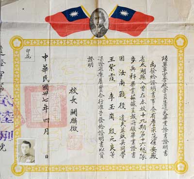 筆者曾在收藏拍賣的網站上看到一張《陸軍軍官學校學員生遺失畢業證書證明書》,紙質,縱34厘米,橫32 厘米,品相為八品。證明書正文為:“陸軍軍官學校學員生遺失畢業證書證明書,為發給證明書事,查有詹宗藩系安徽省太湖縣人,曾在本校十九期第十六總隊步兵科畢業,茲據呈報所領畢業證書,因汝南戰役遺失,并取具同學王紫霞、李玉崗、殷元良等保證確系屬實,合行準予發給證明書以資證明。校長關麟徵,中華民國卅七年四月日。”鈐“陸軍軍官學校校長”、“陸軍軍官學校印”,朱文,篆體。杏黃梅花紋飾邊框,內印雙勾體“親愛精誠”四字,上端印有兩面國旗交叉圖案,孫中山像位于其間。左下角貼詹宗藩照片,邊縫處有“遺證字第弐陸捌號”並鈐騎縫章。