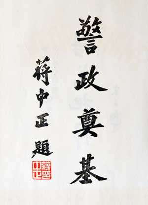 本校自1936年改組成立后,校長蔣介石決心裁團(tuán)改警,乃由校根據(jù)擴充計劃增設(shè)校舍,預(yù)定每年訓(xùn)練四、五千人,三年內(nèi)訓(xùn)練保安警察干部二萬人,一切籌備已具規(guī)模,嗣以抗戰(zhàn)發(fā)生,情殊勢異。1937年11月首都告急,本校隨國府西遷重慶市,擇定南岸彈子石日租界童家花園為校舍,添建了大禮堂、操場、教室等,各期學(xué)生五百人亦繼續(xù)到渝加緊訓(xùn)練,弦誦不輟,并招收第五期新生五百人,較之在南京時增加了一倍。至1939年7月第四期畢業(yè)時,校長蔣介石親臨主持典禮,視察訓(xùn)勉,并親書“警政奠基”四字。