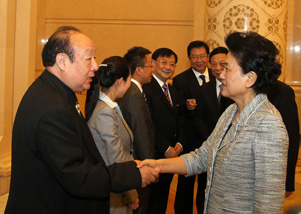 2012年9月27日劉延東同志在北京人大會堂接見侯伯宇事跡全國巡講團成員。圖為劉延東同志與侯伯文握手。