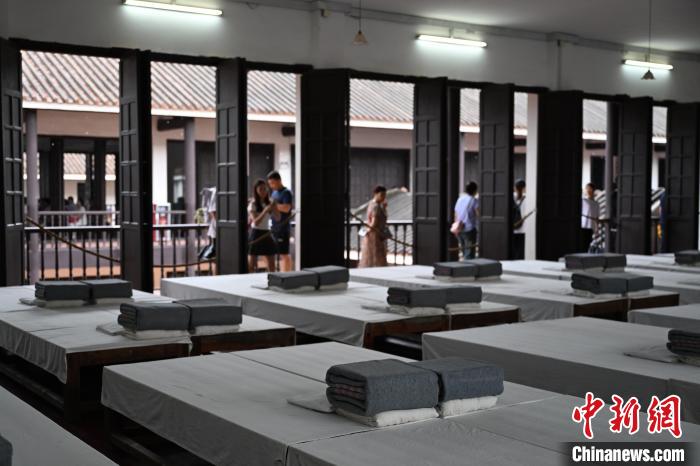 6月16日,廣州市黃埔區,黃埔軍校舊址紀念館重新開館。其中,全新策劃布展的“國共合作的不朽豐碑——大革命中的黃埔軍校(1924-1927)”校史展,通過300余張歷史圖片,以“歷史實物+多媒體還原”的形式,呈現了國共合作時期的黃埔軍校歷史,展出170件套展品,除館藏的82件套外,其余均為來自全國20個單位、黃埔后人及藏家的藏品。“黃埔同學錄查詢室”數據庫正式上線,現已收錄的黃埔軍校學員資料超過17萬人,支持以姓名、籍貫等各種方式模糊查詢。圖為黃埔軍校舊址紀念館的學生宿舍吸引參觀者。中新社記者 陳楚紅 攝