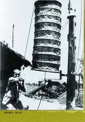 在陳列的一張圖片上,負(fù)責(zé)掛起警報(bào)球的工作人員,正用力地拉動(dòng)麻繩將兩個(gè)相連的球體掛上木桿的頂端。張榮祥說,這張照片上的警報(bào)球是抗戰(zhàn)時(shí)期的國(guó)軍防空部隊(duì)用來進(jìn)行空襲報(bào)警的,根據(jù)日本轟炸機(jī)距離的遠(yuǎn)近,依次掛上不同的個(gè)數(shù),陪都市民在遠(yuǎn)處看到后就能判斷危險(xiǎn)程度。這個(gè)掛燈籠的高地現(xiàn)在就叫“紅燈壩”。