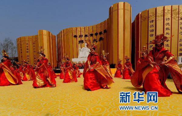 4月5日,舞蹈演員在辛卯年黃帝故里拜祖大典上表演樂舞敬拜。