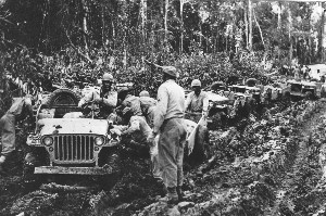 為了修建史迪威公路,美軍工程兵正努力將一輛吉普車推出淤泥。